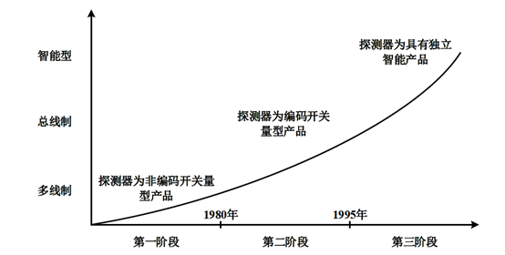 ? ? 第一階段產(chǎn)品為多線制火災(zāi)探測報(bào)警系統(tǒng),探測器為非編碼開關(guān)量型產(chǎn)品。每個(gè)探測器除需提供兩根電源線外,還需要提供一根報(bào)警信號(hào)線。目前國內(nèi)除極少數(shù)廠家仍在生產(chǎn)外,該產(chǎn)品基本上已處于被淘汰狀態(tài)。